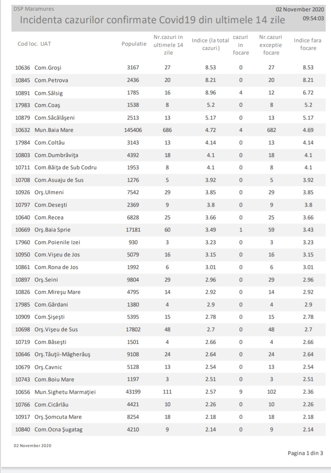 Mai jos, vă prezentăm raportul oficial al DSP Maramureș cu privire la incidența cazurilor de infectare, pentru fiecare localitate din Maramureș.